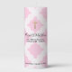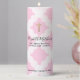 Elegant, pink design with a circle pattern, printed gold cross, modern script font for the name. This baby baptism, thank you candle features a bible verse,