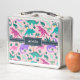 Personalize this cute dinosaur themed lunchbox with your child’s name in white lettering for a cool custom touch! Created especially for dino-loving kids, this colorful design features pink, purple, and mint green dinosaur illustrations on a blush pink background.