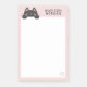 Cute post it notepad in pink with a cute dark gray cat with little paws and blushing cheeks and green eyes. A paw print at the bottom of the page in pale pink. Add your name in dark gray letters. A cute animal notepad.