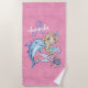 Custom mermaid pink beach or swimming pool towel for a girl. Monogrammed with her initial and name. It features a cute blond mermaid, a dolphin, and a turtle with stars and other sea creatures with a pink and gold mermaid scale background.
