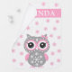 Pink Cute Owl Baby Girl Baby Blanket. Pink & gray little baby owl wearing a bow, pink snowflakes. Custom name on a pink ribbon. Cute & lovely gift for a baby shower or a newborn baby girl.
