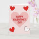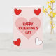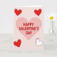 This greeting card features a large light pink heart centered on a soft pale pink background. Inside the heart, the words “HAPPY VALENTINE’S DAY” appear in thick, rounded deep red letters that are easy to read and gently stand out. Four smaller hearts sit near the corners, framing the main design. Two of them are dark red with short white dash marks that look like simple stitching, while another is solid dark red. The last small heart is white with a dark red outline and matching dash details. The soft pink and red colors give the card a warm, caring feel, making it a lovely way to share Valentine’s Day wishes with someone special ❤️.