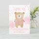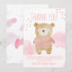 This adorable baby shower thank you card features a sweet watercolor illustration of a sleeping teddy bear dressed in a cozy soft pink sweater, nestled among fluffy pastel clouds and delicate pink hearts. The charming design combines woodland charm with gentle, soothing colors, perfectly capturing the warmth and joy of welcoming a baby girl. The playful "Thank You" text in matching pink adds a stylish and heartfelt touch, making it the ideal way to express gratitude to friends and family after your special celebration.