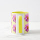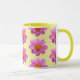 A pattern of a pink dahlias on a yellow background. Even if the flowers aren't flowering in the garden, they are when you reach for this mug. Think of Summer when you drink your coffee or tea.