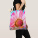 A bright pink daisy against a bright blue background. The bottom of the tote is decorated with a water color polka dot pattern.