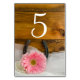 Customize these charming Pink Daisy and Horseshoe Country Western Wedding Table Numbers to add a charming accent to your casual yet classy ranch style bridal shower, engagement barn party or marriage reception. This rustic chic design feature a quaint floral photograph of a pink gerber daisy flower blossom, rusty horseshoe, pearl necklace and white bridal veil with a brown weathered barnwood background.
