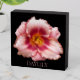 Square, wooden box sign designed for hanging or standing that features the photo image of a pink Daylily bloom on a black background. A dramatic, floral design! Makes a lovely, home decor display!