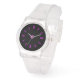I only have one complaint. I ordered the watch with clear case and strap, and what was sent was white case and strap. I'm going to keep it because 1) it looks very nice in white, and 2) it would take too long to get a replacement made and sent in time for my occasion. Aside from the mix up with the color, the watch does look very good in white. The purple dial is actually sparkly which did not show in the online images. That was a nice surprise. If you like Swatch watches this is very similar to those. It's 33.6mm in diameter, 10.5mm thick, and 40.6mm lug to lug. Stainless steel case back says 3ATM/30m WR, so no swimming or showering or submerging this one. If you like Woodstock, this is a great choice.