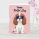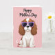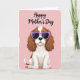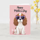This card shows a stylized little dog sitting in the center on a soft pastel pink background, giving off a friendly, affectionate energy ❤️. Its fluffy white coat is accented with warm ginger patches, and long caramel-brown ears curl down in loose waves. The face is partly hidden by oversized lavender-framed sunglasses, and the dark lenses have a faint glossy shine that makes the pup look charmingly self-assured. Above the dog, the words “Happy Mother’s Day” are placed near the top in flowing black lettering, standing out clearly against the pale backdrop. The simple layout keeps the focus on the pup, like it’s posing for someone it adores, with a gentle, companionable feel rather than a loud scene. The lighting looks even and bright, and the pink background carries a lightly brushed texture that adds softness without distracting 🌼. Along the edges, the pink field fades into a slightly distressed, painted border.