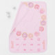 This pretty milestone baby blanket is set up ready for you to personalize with your baby's name. The milestone blankets are a lovely way to watch baby grow each month for the first year. To create the timeline, simply take a snap of your baby girl, laying (or sitting) amid the donuts, with one of her favorite toys (or other object) to mark her age in months. The design features iced ring donuts and a girly color palette of pink and peach. Please browse our store for matching and coordinating items.