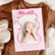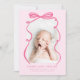 Whimsical and sweet birth announcement card featuring hand drawn photo frame of pink line with a bow at the top.