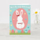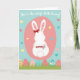On the front of the card a white bunny is shown from behind, centered inside a soft rose-pink oval against a sky-blue background, with a gentle, affectionate mood in the way the figure is quietly posed 🐰. Its long ears have tiny pink speckles, and a red bow with white dots sits between them like a sweet little accent. Across the top, the message “You’re the cutest little bunny!” appears in a flowing, handwritten-style line in a darker shade that stands out clearly on the blue. Just below the bunny, the smaller word “mommy’s” is placed near the bottom of the oval in a matching handwritten look, tying the scene to a close relationship. Floating around the background are small hearts in soft yellow, coral pink, and teal, like little signals of fond attention 🌷. Along the bottom, a band of green grass stretches across the card, giving the bunny a spring setting to stand above. Nestled in the grass are pastel egg shapes decorated with stripes and dots in yellow, pink, and aqua. The bunny’s round tail is drawn as a fluffy circle with concentric pink rings.