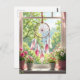 Keep in touch with a friend or family member with this gorgeous postcard with an ai illustration of a beautiful pink feathered dreamcatcher hanging in the window with a shelf of pink and white potted flowers under it, overlooking a yard full of Lucius green trees.