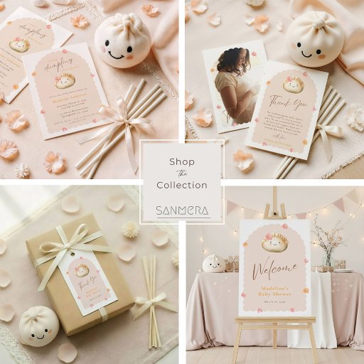 Thank your guests in style with this cute dumpling-themed baby shower thank you card, perfect for celebrating a baby girl. This design features a scalloped edge with soft pink and pastel tones, an adorable kawaii dumpling illustration, and elegant floral accents. Personalize the customizable text to add your heartfelt gratitude to friends and family for their love, support, and generous gifts. This card is ideal for those searching for unique baby shower themes, dumpling baby shower decorations, or Asian-inspired baby shower stationery. It's a charming way to complete your baby shower celebration and leave a lasting impression!