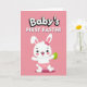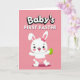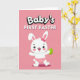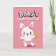 This card shows a cheerful digital illustration in mostly pink tones, centered on a stylized white bunny with long ears, rosy cheeks, and a sweet open-mouthed smile 🐰. A small pink bow sits on its head, and it wears pink patterned bottoms that add a cute, cozy touch. The bunny holds a smooth green egg-like oval in one paw, a fresh spring accent that stands out against the rosy background 🌷. Its bright eyes and slightly tilted pose give it a tender, friendly look, like it’s happily showing its prize to someone close by. Across the upper half, the words “Baby’s FIRST EASTER” appear in large rounded letters, set prominently so the character sits beneath the text. The lettering is a deeper pink than the background, making it easy to read while still matching the overall palette. Behind everything is a soft pink field sprinkled with lighter pink polka dots.
