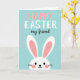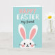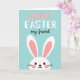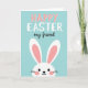 This card features a soft robin’s-egg blue background that sets a calm spring scene 🌷. Near the top, “HAPPY EASTER” sits centered in rounded light-pink lettering that feels friendly and easy to read. Just below it, the smaller words “my friend” appear in flowing black cursive, like a quiet note meant for someone close. Rising from the bottom edge, a simple white bunny face peeks into view, giving the layout a sweet sense of hello 🐰. The bunny’s cheeks carry light rosy blush, and its small curved smile suggests a gentle, affectionate mood. Large black oval eyes and a few thin black whiskers add to the warm, companionable look. Two long white ears stretch upward, with soft pink inner ear details that echo the pink text above. The ears reach into the upper half of the design, framing the centered greeting against the blue backdrop.