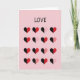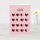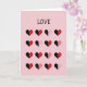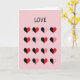 This card features a soft pastel pink background that feels calm and sweet. Near the top, the word “LOVE” is written in black, with a loose hand-drawn look, and it sits centered above the main design. Below it, there’s a neat 4-by-4 group of sixteen hearts, all lined up evenly. Each heart is split down the middle, with the left half filled in solid black. The right halves alternate between deep red and pale pink, creating a simple pattern that still feels romantic. The hearts don’t have faces, but the strong color contrast gives the whole card a clear, confident mood that still reads as caring. Overall, it’s a straightforward design that suits a partner or a close friend, and the pink setting keeps it warm and gentle 💕❤️.