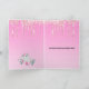 A beautiful illustration of a cute cartoon mother elephant with pink ears clutching her calf to her chest. She has beautiful pink roses on her head and is sitting in a rose bouquet with green leaves. The little baby has a pink ribbon bow and rose flower tied to her little ear. The words, congratulations on the birth of your beautiful baby girl (which may be changed to daughter, princess etc) appears on a white background and the inside has a template for your personalized message set against a soft pastel pink faux glitter background.