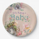 These magical and whimsical baby shower plates feature an enchanted forest theme. An image of a fairy door in a little mushroom garden is placed at the bottom, with a fairy fluttering above it. The background is a vintage style, faded pink parchment paper pattern.