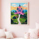 Escape to a world of dreams with this enchanting fantasy castle art poster. A whimsical pink castle, nestled amidst rolling green hills and a vibrant sunset sky, creates a scene of pure magic and wonder. This poster is perfect for sparking imagination! Ideal for children's rooms, playrooms, or anyone who loves fairytales.