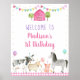 Welcome your party guests with an adorable personalized sign. Frame the sign and display it on a table near the entrance or mount the poster on foam and display it outside on an easel. The design features watercolor farm animals with colorful balloons and faux gold foil confetti.