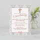 Design features a soft pink lacey look as background to a white rectangular shape, bordered in pink. Shape is background to the image of a crucifix which is displayed above your text. A pink bow appears at bottom of design. Crucifix and text are featured in shimmering foil with the option to choose from gold, silver or rose-gold.