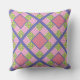 A chic Throw Pillow or Cushion, with a pretty faux-patchwork pattern of deep pink, violet blue and yellow primroses on a leafy green background, with deep pink and white check gingham and polka dots; from the Posh & Painterly "Primroses" collection.