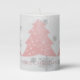 Bring timeless elegance to your holiday décor with this Pink Festive Christmas Tree Pillar Candle, a charming accent for any winter holiday theme. Showcasing a beautiful Christmas tree illustrated by elegant flourishes and snowflake pattern, the design is set against a soft snowy background with falling white snowflakes. A cheerful Merry Christmas message in modern typography completes the look, making this candle a perfect piece of holiday home decor. Ideal for mantel displays, dinner tables, or as a thoughtful seasonal gift, it adds warmth, style, and festive cheer to any space.