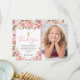 Elegant first holy communion thank you cards featuring a simple white background that can be changed to any color, a photo of your child, pretty pink watercolor flowers, a gold religious cross, and a modern thank you template that is easy to personalize.