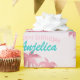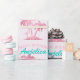 This custom gift wrapping paper features a retro style pink flamingo theme. The image features a flamingo standing beneath a pair of palm trees on a tropical island. The image has a glamorous pink foil pattern with glitter accents. A sample "Happy Birthday" greeting is printed in a pretty bubblegum pink color, with a personalized name printed in a vintage teal font.