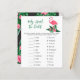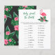 Baby shower invitation design features pink flamingo with lush green palm leaf fronds and tropical hibiscus flowers. "Aloha Baby". A tropical floral pattern with black background color dresses up the back of the card.