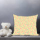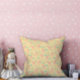 There's a pink flamingo pillow chillin' on a yellow thing. That flamingo pillow, all pink and stuff, is just hangin' out against the yellow background.