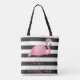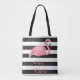 Chick diaper bag, flamingo tote bag with black and white striped background.