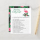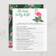 Baby shower invitation design features pink flamingo with lush green palm leaf fronds and tropical hibiscus flowers. "Aloha Baby". A tropical floral pattern with black background color dresses up the back of the card.