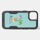 Otterbox phone case with a cute illustration of a pink flamingo in a red santa hat. Standing beside a green palm tree on a mound of yellow sand. A fancy swirly christmas tree design is placed beside the text Merry Christmas. Written in the color pink in a fancy handwritten font. Pastel green background.