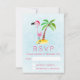 An RSVP card with a whimsical drawing of a pink flamingo wearing a red santa hat. Standing on a mound of yellow sand with a green and brown coconut palm tree in the back. Light blue background.