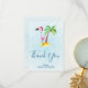 A flat thank you card with a whimsical drawing of a pink flamingo wearing a red santa hat. Standing on a mound of yellow sand with a green and brown coconut palm tree in the back. Light blue background. Cute and fun festive design.