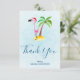 A flat thank you card with a whimsical drawing of a pink flamingo wearing a red santa hat. Standing on a mound of yellow sand with a green and brown coconut palm tree in the back. Light blue background. Cute and fun festive design.