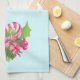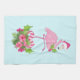A kitchen towel with a tropical themed Christmas flamingo wearing a pink santa hat. Underneath its feet is a candy cane bouquet with pretty tropical flowers and pink berries. A sprig of holly on its chest.