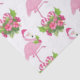 Patterned tissue paper with a tropical themed Christmas flamingo wearing a pink santa hat. Underneath its feet is a candy cane bouquet with pretty tropical flowers and pink berries. A sprig of holly on its chest.