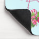 A mousepad with a tropical themed Christmas flamingo wearing a pink santa hat. Underneath its feet is a candy cane bouquet with pretty tropical flowers and pink berries. A sprig of holly on its chest.