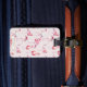 Personalized tropical luggage tag featuring pink flamingos.