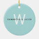 This ornament features a couple of pink flamingos wading in water. Back of ornament has names along with a monogram for you to personalize. Blue background color may be changed by customizing.