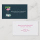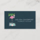 Business cards with an illustration of a pink flamingo with green palm trees behind and a decorative floral succulent bouquet below. Tropical and pretty. The