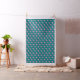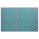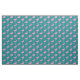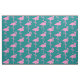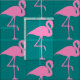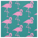 A pattern of pink flamingos is on teal fabric. The bird is standing on one leg.