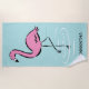 This beach towel features a pink flamingo wading in water with a name below for you to personalize. Blue background color may be changed by customizing.