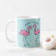 This tropical mug features a couple of pink flamingos wading in water. Left side has a town and state and right side has a name for you to personalize. Blue background color may be changed by customizing.