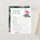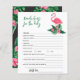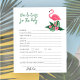 Baby shower invitation design features pink flamingo with lush green palm leaf fronds and tropical hibiscus flowers. "Aloha Baby". A tropical floral pattern with black background color dresses up the back of the card.