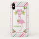 A whimsical tropical christmas phone case personalized with a name. A fancy pink flamingo with a leg raised up. Wearing a pink santa hat and some seasonal holly. Holly with berries also decorate the corners. A floral bouquet with candy canes above her head. A pink and green candy cane striped background.