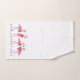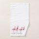 Pink flamingo Christmas bath towel set with facecloth / washcloth, hand towel and bath towel to buy in a set or individually. White towels, with pink birds at the edges, dressed in festive wreaths of holly and hibiscus flowers. Unique and tropical design for the bathroom that needs a tropical holiday theme. This set works year round, as the Christmas theme is not readily apparent.